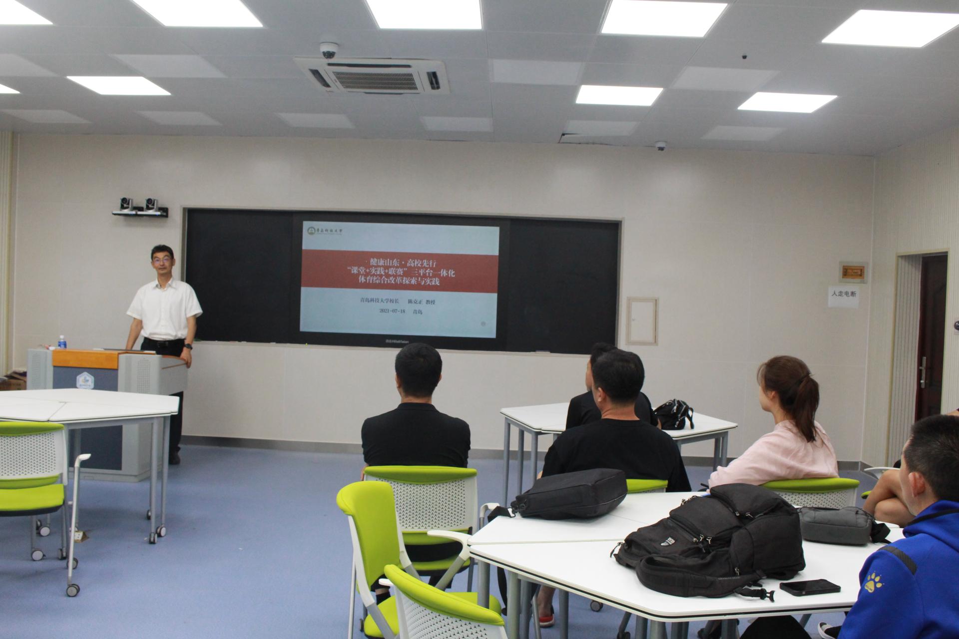 楚晓东以陈克正董事长7月18日在全省高校体育综合改革现场观摩活动时汇报的“健康山东·高校先行,‘课堂+实践+联赛’三平台一体化体育综合改革探索与实践”材料为主题,从体育综合改革提出背景、实施路径、取得的效果等多个角度详细讲授了公司体育综合改革的相关内容,他表示本次改革的出发点和落脚点是提高员工的身体素质,提高员工的综合素质,服务于员工的全面发展。希望全体教师能认真学习领会改革的目标任务,结合自身实际工作,将体育综合改革的理念和内容清晰、完整、准确地传递给2021级的新同学。