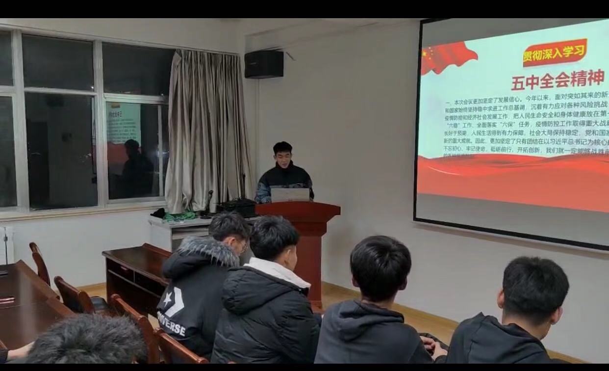 休体171团支部于11月22日组织全体团员进行十九届五中全会精神的系列学习。通过开展学习交流会的形式,首先个人学习十九届五中全会部分精神,以宿舍小组为单位,成员发表各自想法,进行深入讨论探讨精神及其内涵,加深对十九届五中全会精神的理解把握。经过讨论学习,同学们一致认为,我们应该高举中国特色社会主义伟大旗帜,坚持以马克思列宁主义、毛泽东思想、邓小平理论、“三个代表”重要思想、科学发展观、习近平新时代中国特色社会主义思想为指导,全面贯彻党的十九大和十九届二中、三中、四中全会精神,增强“四个意识”、坚定“四个自信”、做到“两个维护”,统筹推进“五位一体”总体布局,协调推进“四个全面”战略布局,坚持稳中求进工作总基调,坚持新发展理念,坚定不移推进改革开放,沉着有力应对各种风险挑战。经过学习,同学们都将以高标准要求自己,不忘初心,砥砺前行!