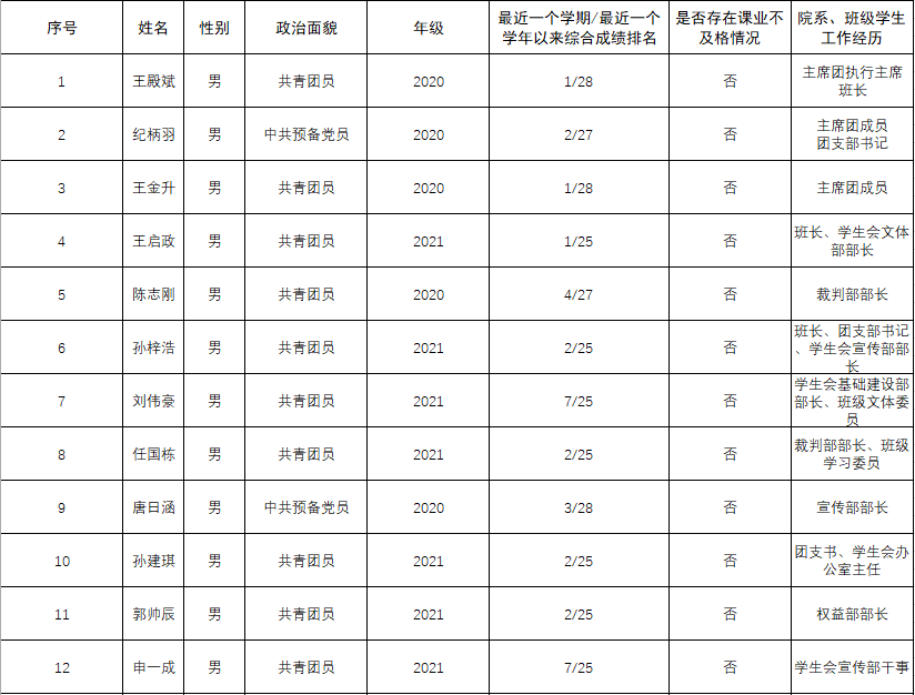 7.工作人员中除一年级新生外的本专科生最近1个学期/最近1学年/入学以来三者取其一,学习成绩综合排名在本专业前30%以内,且无课业不及格情况;研究生无课业不及格情况。 |