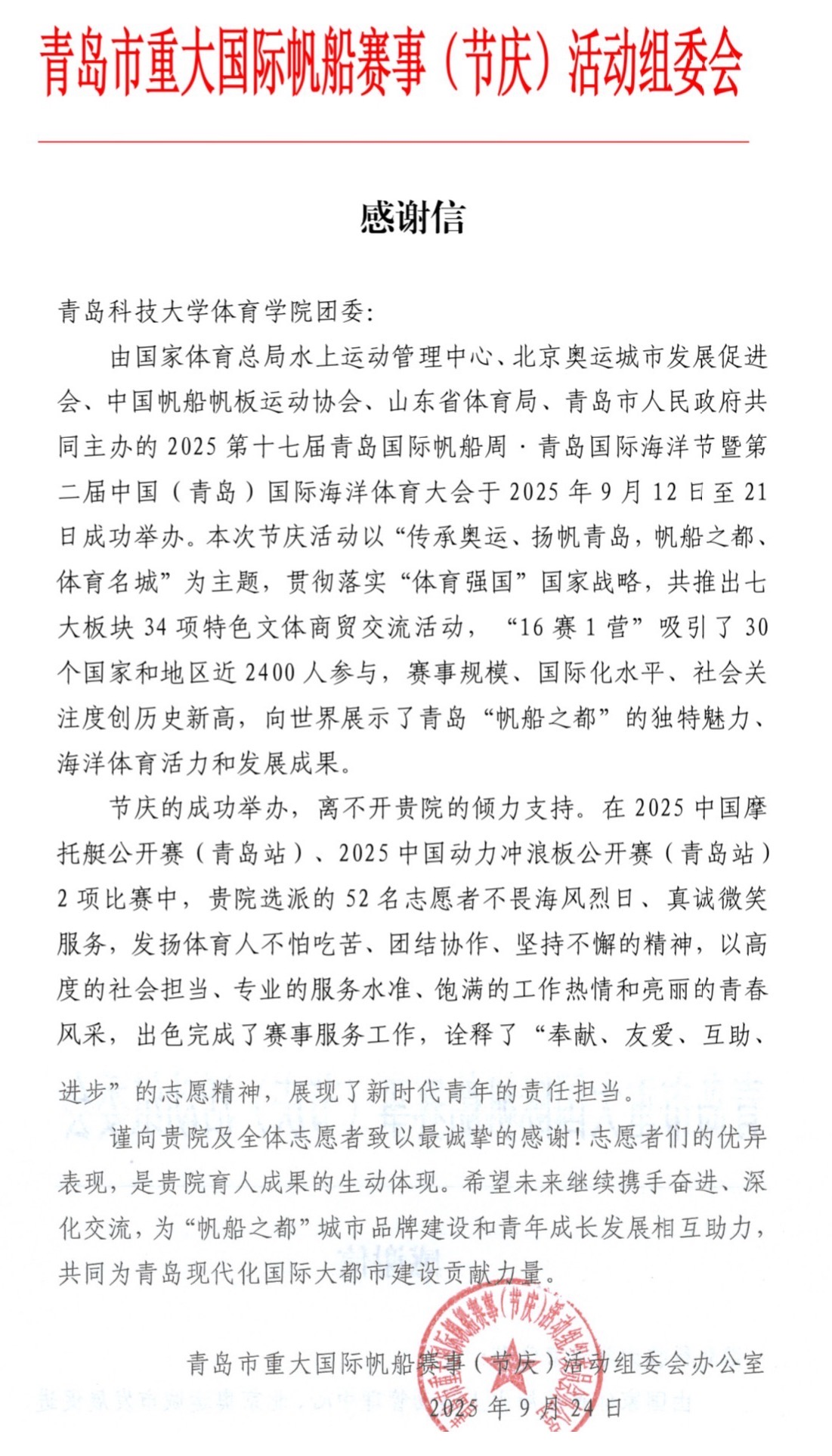 近日,青岛市重大国际帆船赛事(节庆)活动组委会向来利国际旗舰厅团委发来感谢信,对公司52名志愿者在2025第十七届青岛国际帆船周·青岛国际海洋节暨第二届中国(青岛)国际海洋体育大会中的突出表现给予高度肯定。