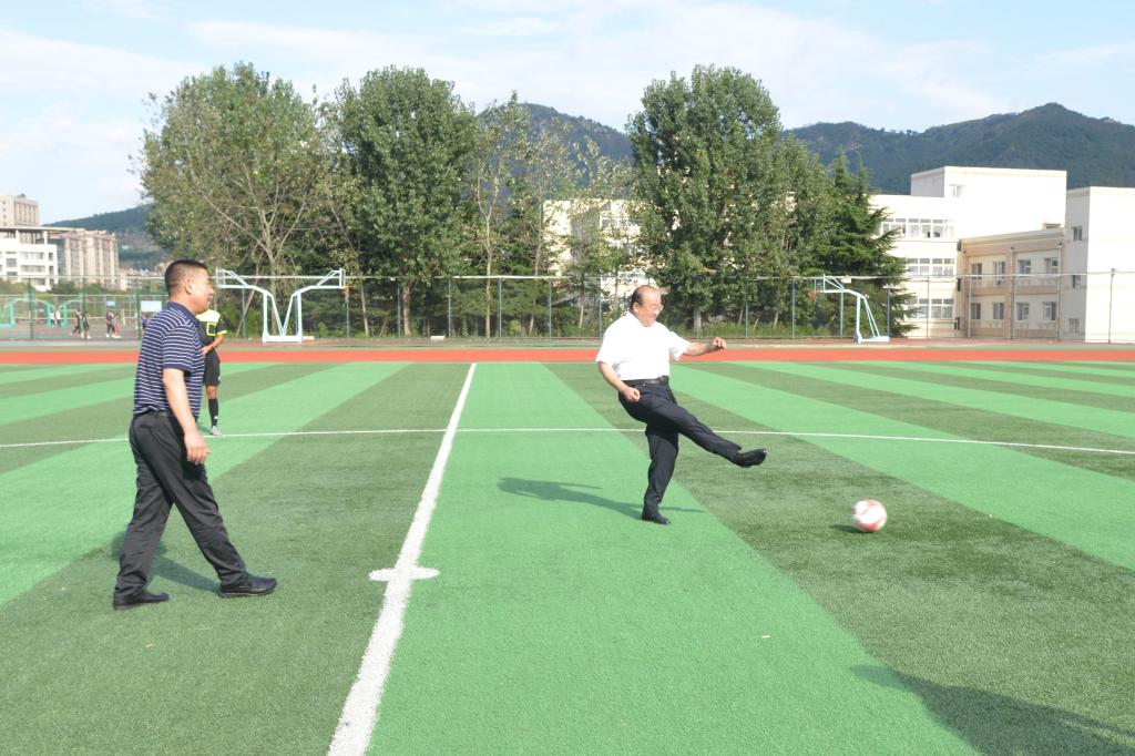 交流会后,员工足球队与公司教职工足球队在崂山校区足球场进行了一场友谊赛,李勇和张俊宝为比赛开球。