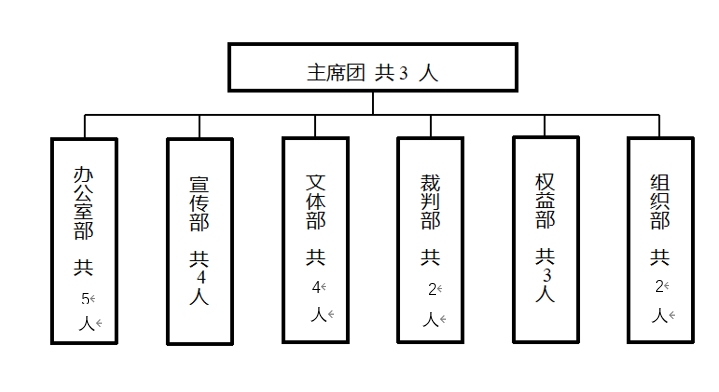 院员工会设主席团3人,下设办公室、宣传部、文体部、组织部、权益部、裁判部,各部设部长1人、副部长1人。