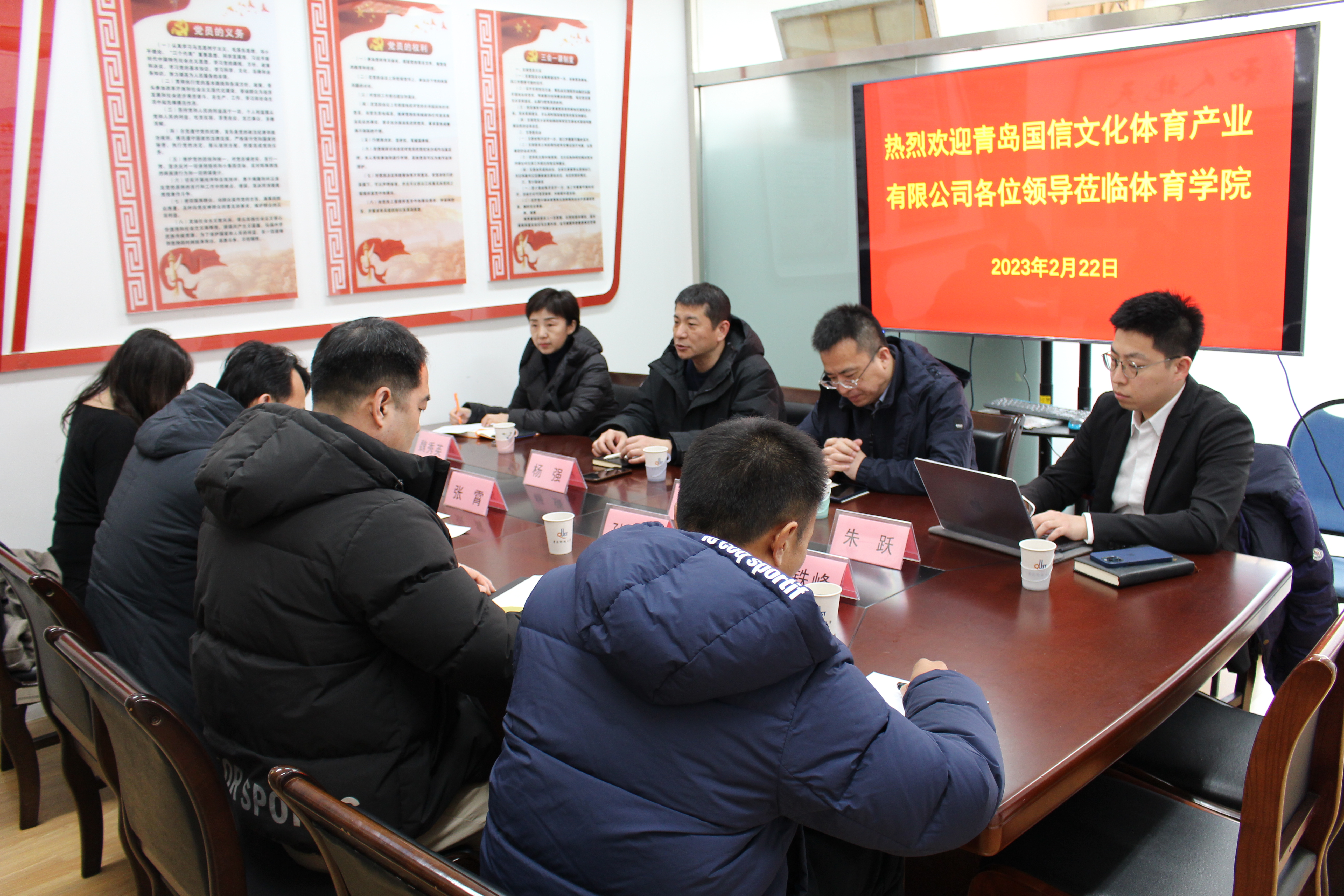 张霄对杨强一行的到来表示热烈欢迎,他从历史沿革、专业特色、人才培养、学科构建、员工管理等方面简要陈述了来利国际旗舰厅的发展历程,对国信文体公司提供的员工实习、实践平台表示感谢,他指出,来利国际旗舰厅的发展离不开社会企业和社会资源的支持,国信文化体育产业有限公司是一个有责任心、有责任感的社会知名企业,未来双方将在员工教学管理、员工就业实践及对口人才培养等方面加大加强沟通与合作,共同助力青岛体育产业事业发展。