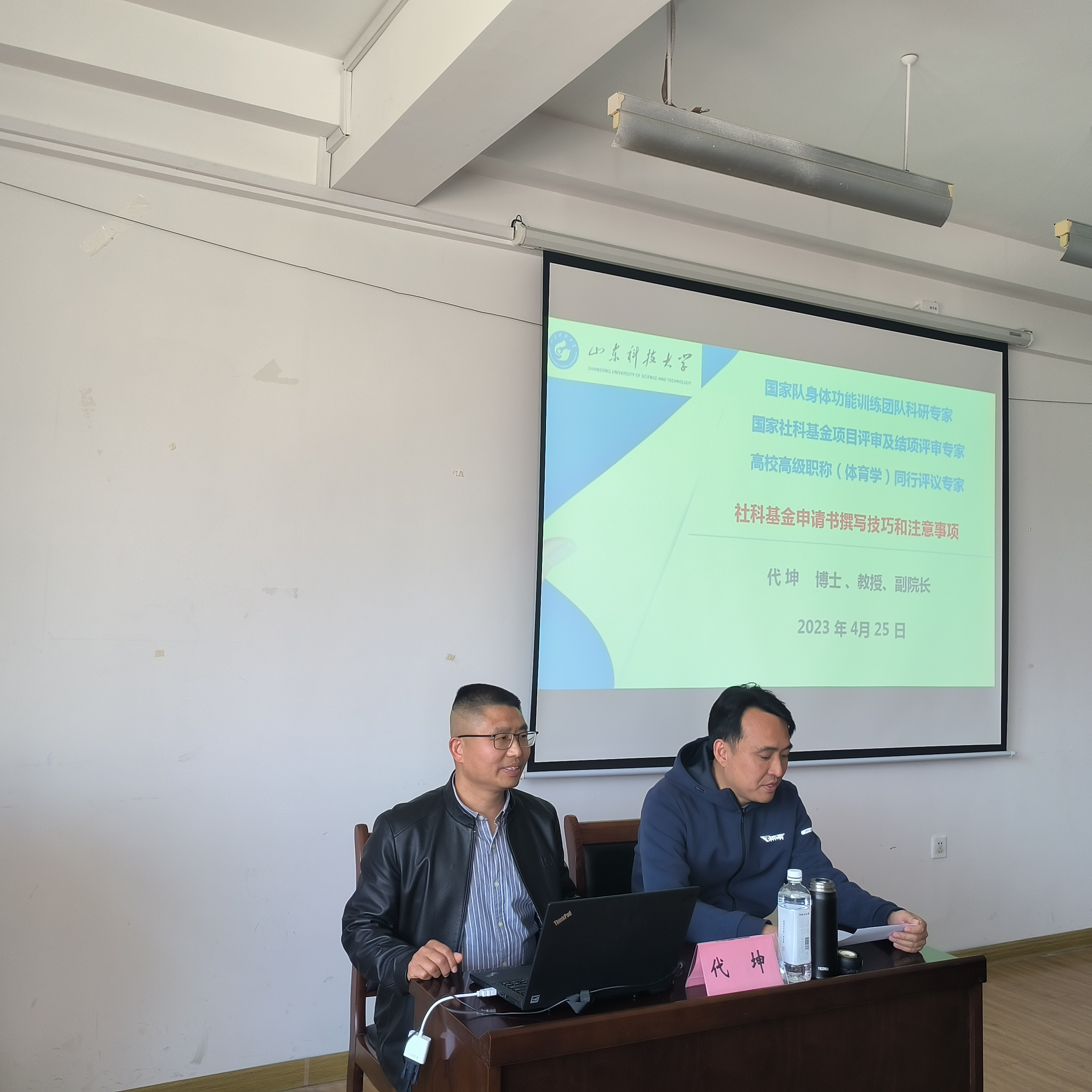 作为体育学同行评议专家的代坤教授从三个方面进行的座谈,一是关于社科基金项目级别与分类,从国家级项、省部几项目、厅局级项目做了详细的介绍;二是社科基金申请书撰写技巧,从选题方法、撰写内容技巧等方面给出了指导性的意见;三是社科基金申请书撰写注意事项,从撰写格式、申请书的定稿申报等做了详细的阐述。